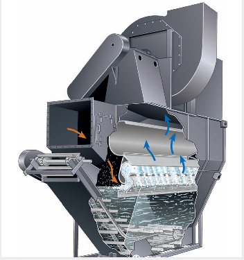 高效湿式除尘器主要包括收集、过滤、机械除湿、清洁气体排放等过程。含粉尘的进入后,通过动力学原理设计的叶片,进入水幕过滤,清洁后的气体通过排气扇除湿后排放进入大气。