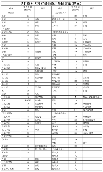 常熟生态环境发布“致全市挥发性有机物排放企业负责人的一封信”,近期不少市局也以这种方式再次通告辖区内VOCs治理的统一要求。文中提及“一次性活性炭吸附废气处理设施必须使用柱状炭(颗粒炭),碘吸附值不低于800毫克/克,并按设计要求足量填充、及时更换”。吸附VOCs的活性炭其实CTC值是更具有表征意义,碘值是其次。此外,活性炭对各类VOCs物质的吸附容量,也是计算活性炭更换周期或判断其吸附效果的重要参数之一,下面分享活性炭对各类VOCs的吸附容量数值,如下: