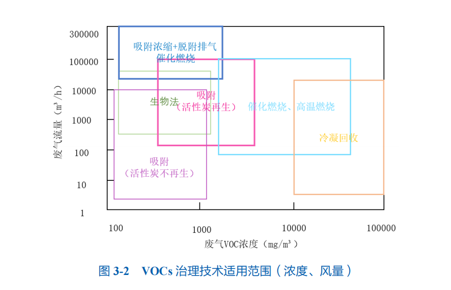 图3-2直观地给出了不同单元治理技术所适用的有机物浓度和废气流量的大致范围。对于废气流量,图中给出的是单套处理设备最大处理能力和比较经济的流量范围。当废气流量较大时,可以采用多套设备分开进行处理。由图可知,吸附浓缩+脱附排气高温焚烧/催化燃烧组合技术适用于大风量低浓度VOCs废气的治理;生物法适用于中等风量较低浓度VOCs废气的治理;吸附法(更换活性炭)适用于小风量低浓度VOCs废气的治理;活性炭/活性炭纤维吸附溶剂回收适用于中大风量中低浓度VOCs废气的治理;催化燃烧法、高温燃烧治理技术适用于中小风量中高浓度VOCs废气的治理;冷凝回收法适用于中低风量高浓度VOCs废气的治理。高浓度的VOCs废气一般都不能只靠单一的技术来进行治理,一般都是利用组合技术来进行一个有效的治理,如采用冷凝回收+活性炭纤维吸附回收技术等。