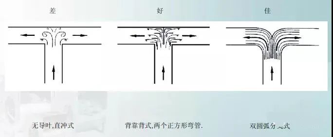 理想的风机工况是气流能沿轴向均匀进出,而无任何方向的紊流。各种工况下都会产生进气涡流。但有时产生涡流的原因并不明显。一些常见的管接头可能产生进口涡流,但由于管接头的多样性,不计入系统附加阻力系数。建议避免使用这些配件。但是,如果不可能,可以使用导叶和分流板来改善进口条件。消除涡流。